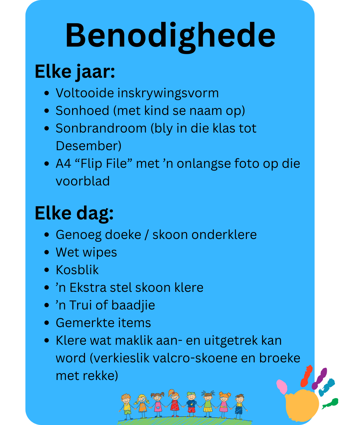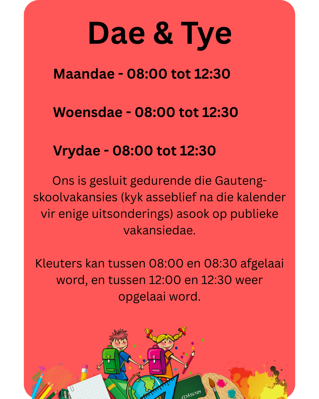Ons doel is om ’n liefde vir God, ander mense en leer te kweek, terwyl ons kleuters voorberei op die volgende groot stap in hulle leerreis.