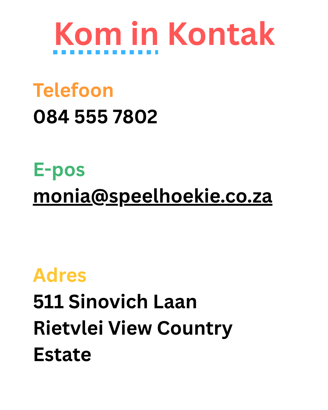 Ons hoor graag van jou! As jy enige vrae het oor Speelhoekie, ’n plekkie vir jou kleuter wil bespreek of net meer wil weet oor hoe ons klasdae werk, is jy meer as welkom om ons te kontak.